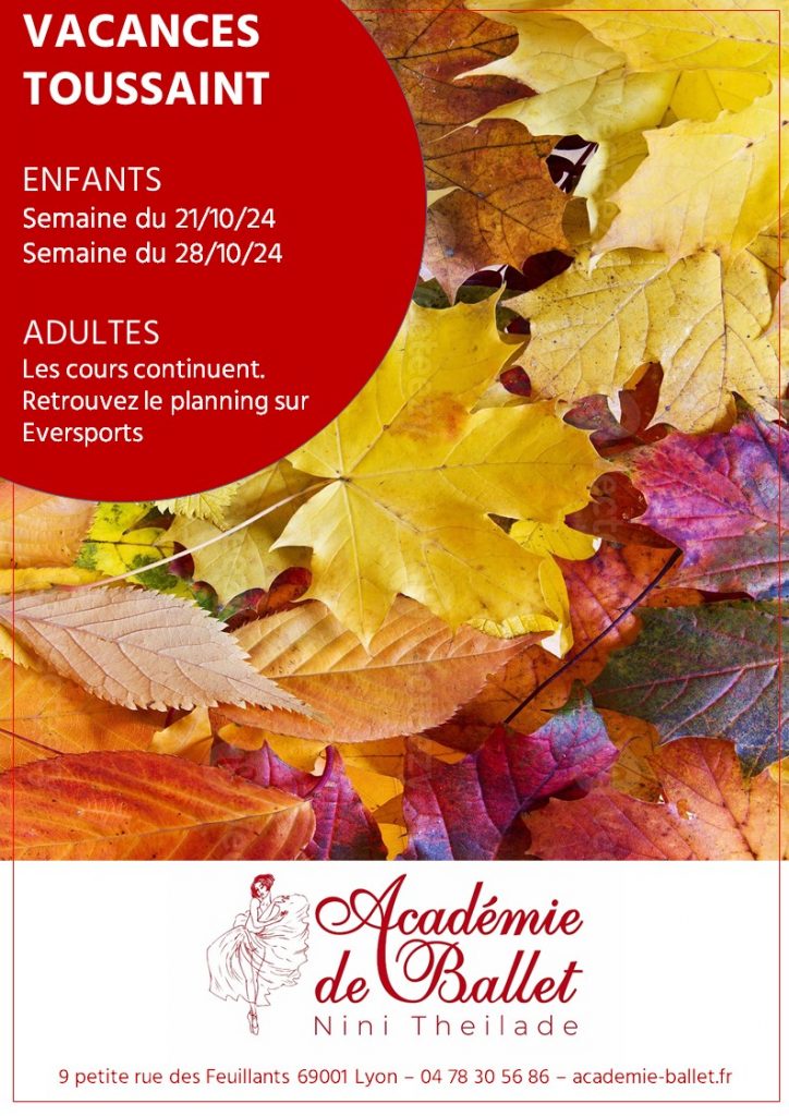 Pendant les vacances de la Toussaint, les cours Adultes continuent. Reportez-vous au planning sur Eversports Stage enfant 6-13 ans lundi 20 au vendredi 24 de 9h30 à 12h30 Cours de danse classique caractère et comédie musicale Lien inscriptions Les cours Enfants habituels ne sont pas dispensés pendant les vacances. Dernier cours Enfants : samedi 18 … Continuer la lecture de « Vacances de la Toussaint et 11 novembre »